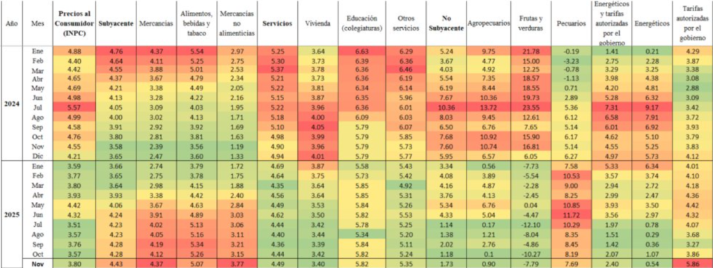 - Energéticos y tarifas autorizadas: Este componente registró la inflación anual más alta al alcanzar 5.86%, impulsado por la eliminación del subsidio a tarifas eléctricas de temporada cálida en 11 ciudades adicionales durante noviembre. Estas ciudades se suman a las 18 donde el subsidio concluyó en octubre, generando un incremento mensual de 20.70% en electricidad con una incidencia de 0.28 puntos porcentuales sobre la inflación general.