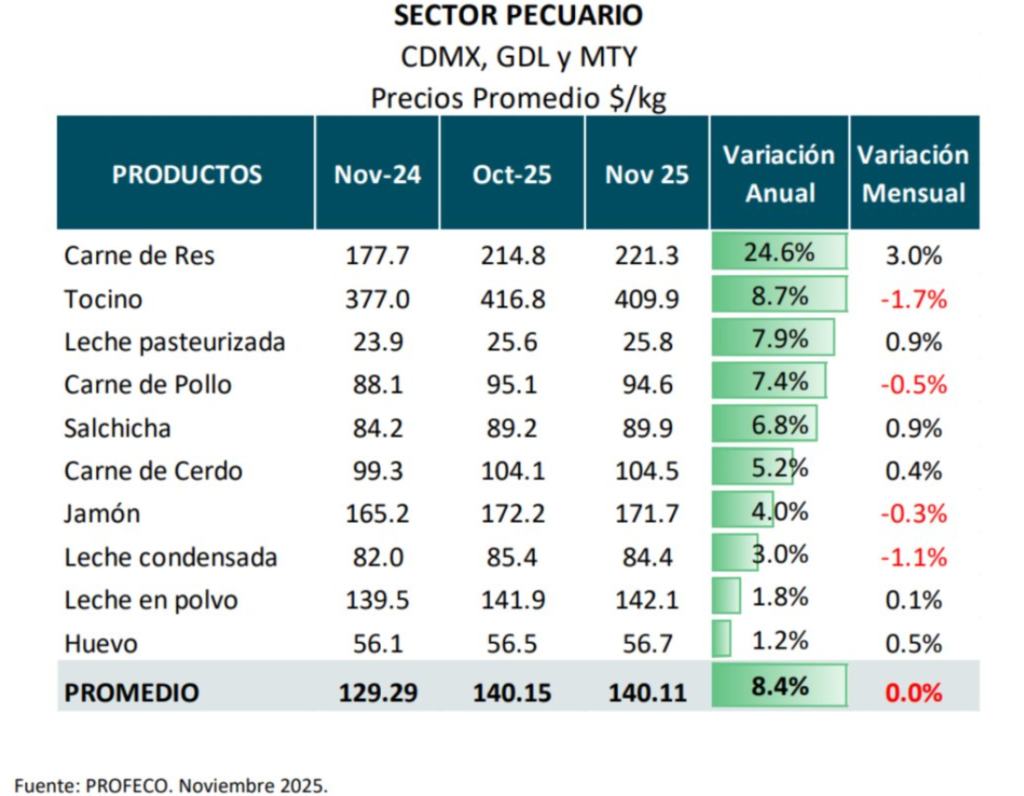 - Sector No Subyacente: tras 9 meses consecutivos de alzas (5.14% en nov. 24 hasta 10.29% en julio), el sector pecuario ha revertido su tendencia, cayendo a 7.69% en noviembre.