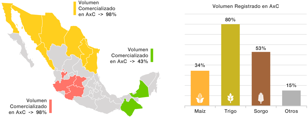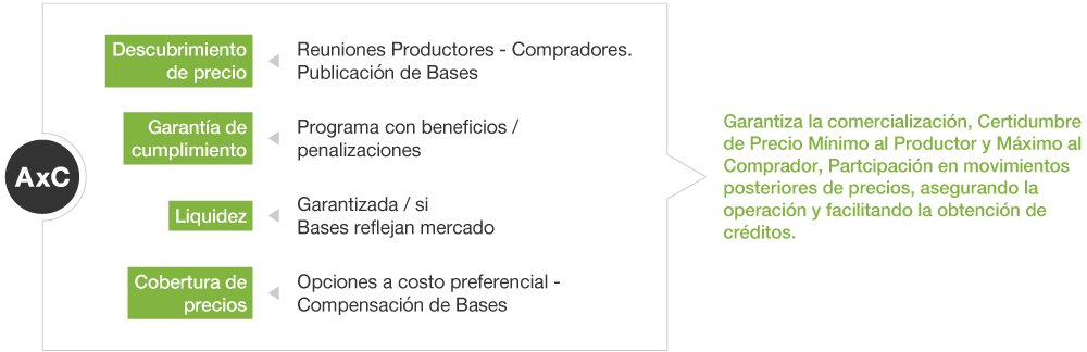 - El esquema de AXC funciona desde el 2004 y ha otorgado certidumbre a la comercialización de las cosechas excedentarias de los granos básicos, un precio mínimo al productor y máximo al comprador.