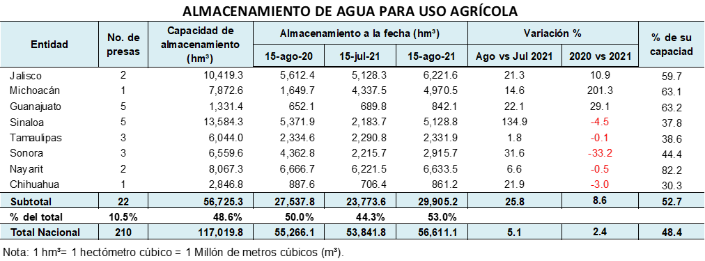 • La disponibilidad actual de agua en las presas de uso agrícola es de 29.9 mil hm³, 8.6% mayor a lo registrado a la misma fecha de 2020.