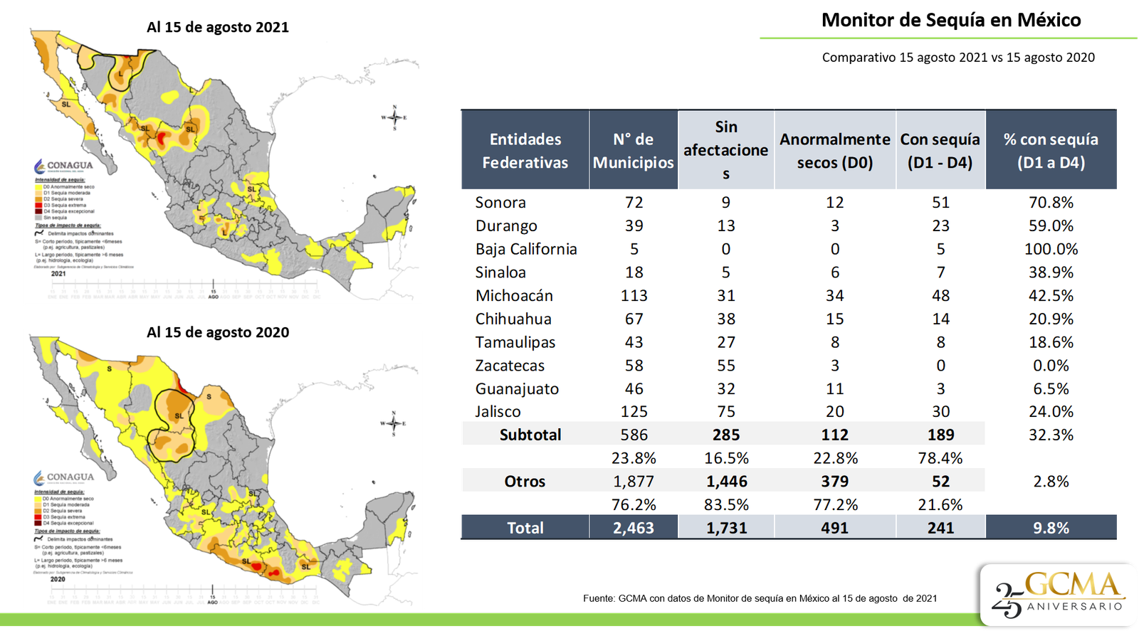 Elaborado por GCMA, con datos de la CONAGUA | Monitor de Sequía | Cifras al 15 de agosto de 2021.