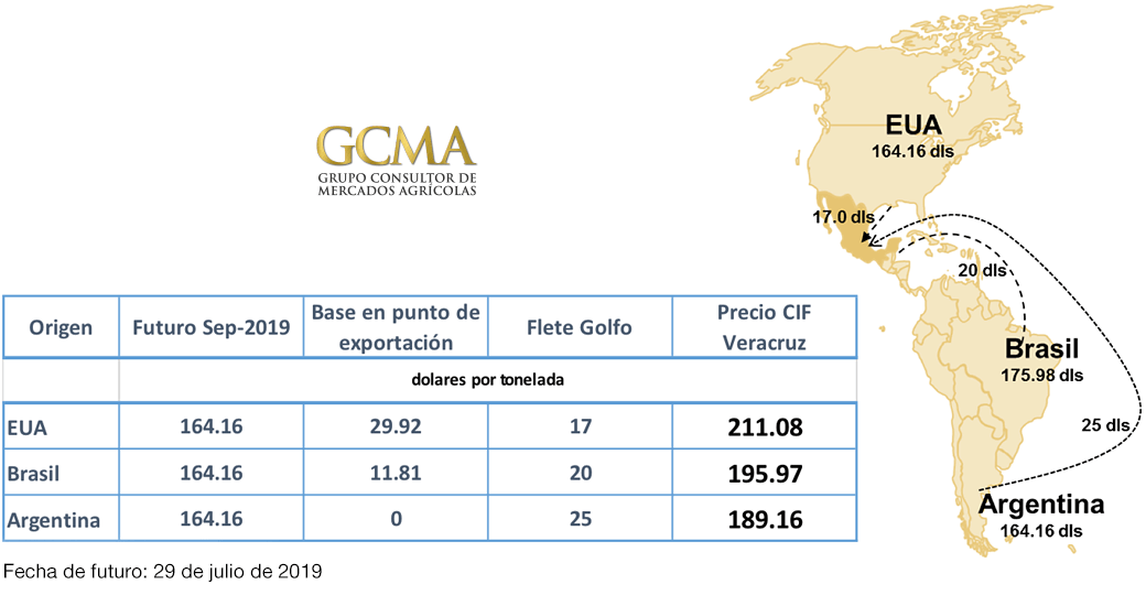 Se habla de la entrada de hasta 1.5 millones de toneladas de maíz sudamericano a nuestro país para el último cuatrimestre del año, posiblemente en su mayoría de origen brasileño. Las compras del grano podrían acelerarse por los precios más competitivos, principalmente por parte del sector pecuario. De acuerdo con el análisis de precios Costo y Flete, al día 29 de julio, el maíz brasileño y argentino son más baratos que el de origen estadounidense.