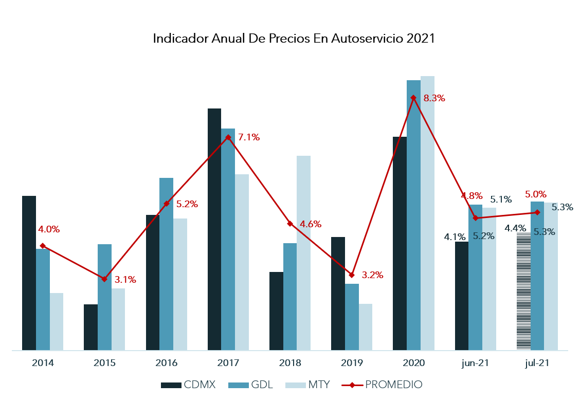 • El precio promedio de la canasta básica en las tres ciudades: CDMX aumento de 4.1% a 4.4%, Guadalajara sube ligeramente de 5.2% a 5.3% y Monterrey asciende de 5.1% a 5.3%.