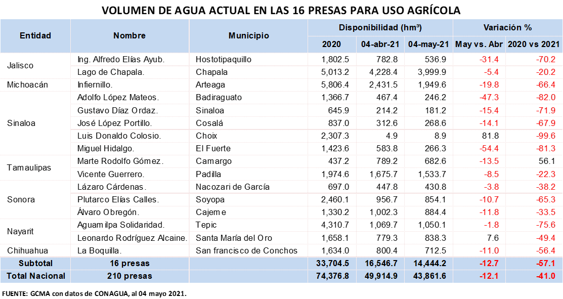 - La disponibilidad actual en las presas de uso agrícola es de14.4 mil hm³, es decir, 57.1% menor al registrado a la misma fecha de 2020 y 12.7% menor de lo que se disponía en abril de este año.