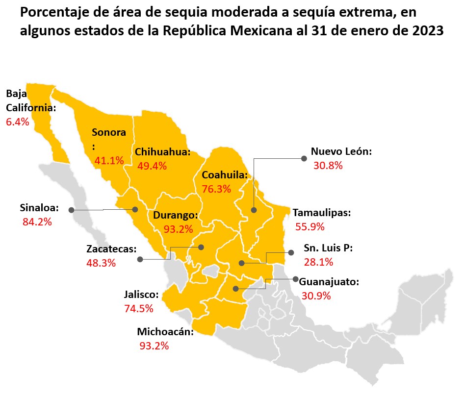 Elaborado por GCMA, con datos de la CONAGUA | Monitor de Sequía | Cifras al 31 de enero de 2023.