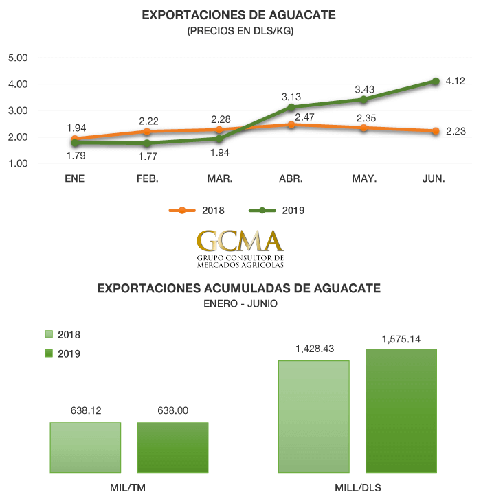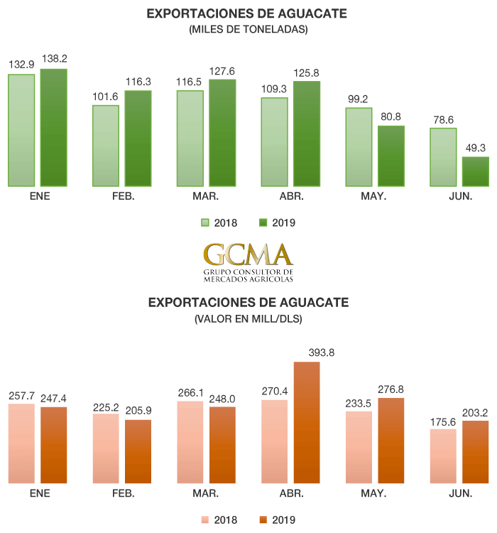 Las exportaciones de Aguacate 2019 vs 2018 de enero a junio se mantienen en volumen y en valor crecieron 10%
