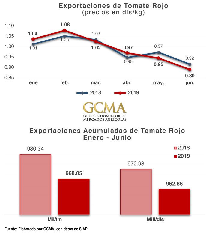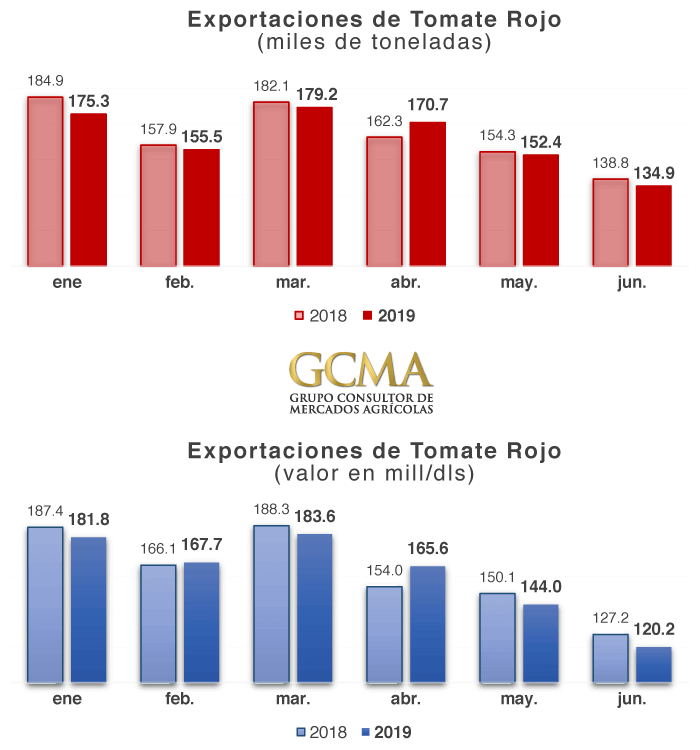 Las exportaciones de Tomate de enero a junio del 2019 vs 2018, son menores en volumen el 1.26% y en valor de 2%