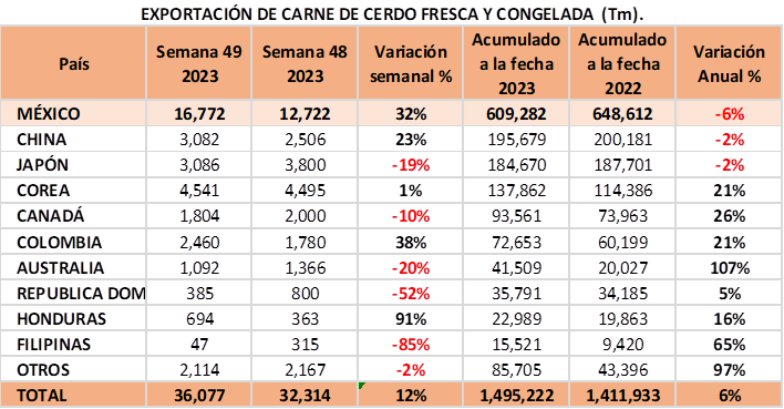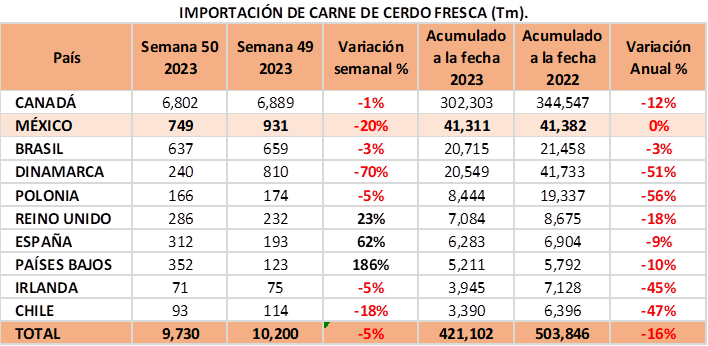 - Las importaciones de carne de cerdo fresca se redujeron en 5% semanal, para alcanzar 421 mil tm en 2023 y se ubica 16% por debajo del mismo periodo del 2022.