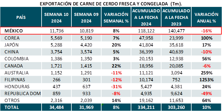 - México aumentó sus compras de carne fresca de cerdo a EUA en un 8% en la última semana, con 11.7 mil tm adquiridas, lo que eleva el total a 118 mil tm en 2024.