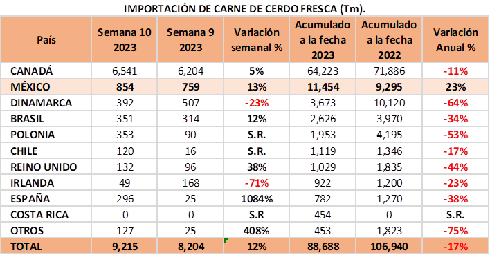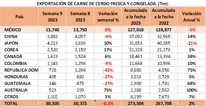 La importación de Carne de Cerdo a EUA aumenta esta semana en 12%, y solamente México aumenta en el acumulado el 23% en comparación al año pasado
