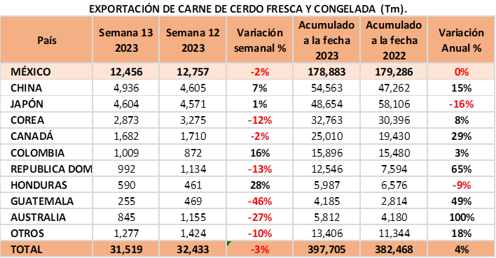 •  Las importaciones de carne de cerdo fresca aumentaron en 14% contra la semana pasada, a pesar del incremento de esta semana permanece el decremento del 18% respecto de 2022