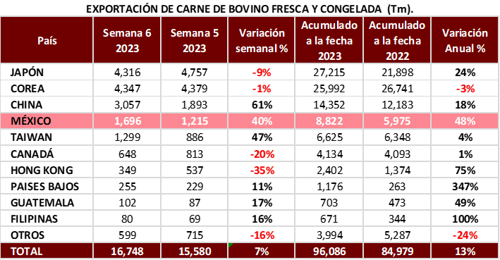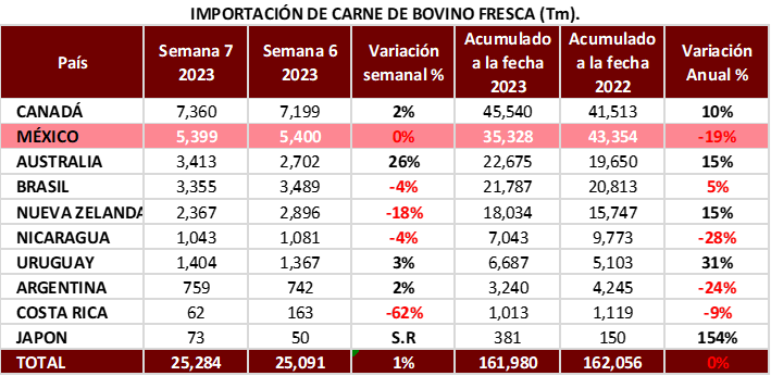 - Las importaciones de carne de res fresca a EUA, esta semana tienen un ligero incremento del 1% en comparación a la semana pasada, llegando a las 161.9 mil Tm este 2023.