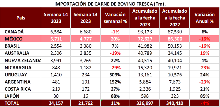 • Las importaciones de carne de res fresca aumentan en 11% semanal debido a la demanda interna, llegando a 329 mil TM, ubicándose 4% por debajo de 2022.