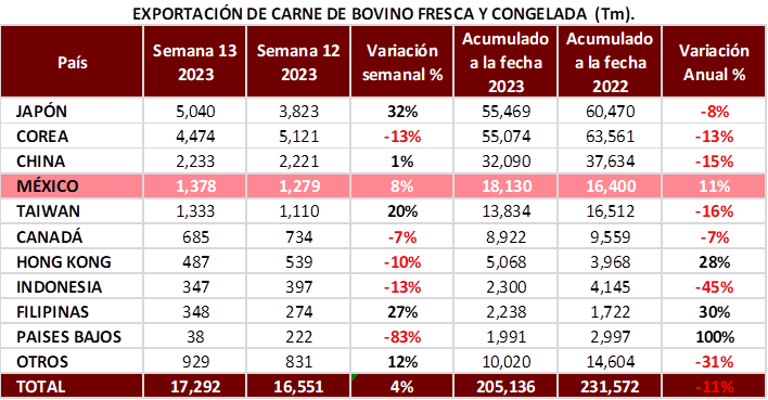 • Japón nuevamente como el principal destino de la carne estadounidense, con un aumento del 32% semanal, mientras que Corea reduce sus compras semanales en 13%.