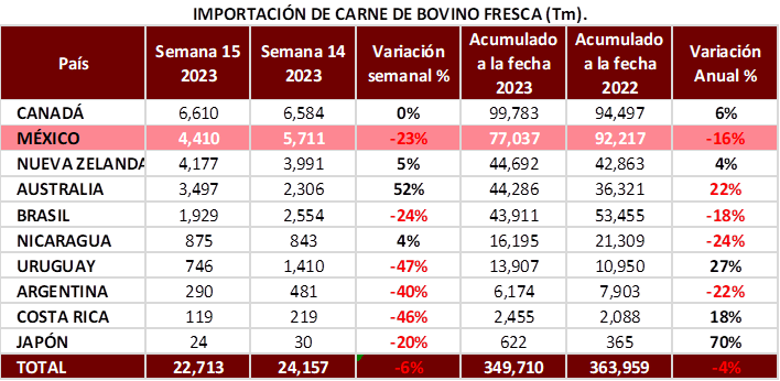 - México el segundo gran proveedor de carne de bovino en EUA muestra una contracción semanal de 23% alcanzando las 77 mil TM este 2023.