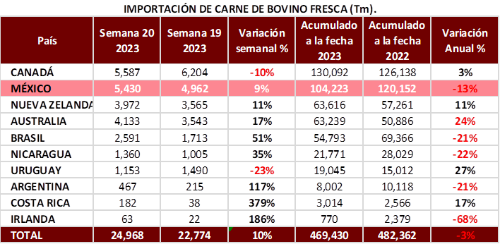 Las importaciones de carne de res fresca a EUA aumentan un 10% contra la semana pasada, llegando a las 469.4 mil TM este 2023, y se ubica 3% por debajo del mismo periodo del 2022.
