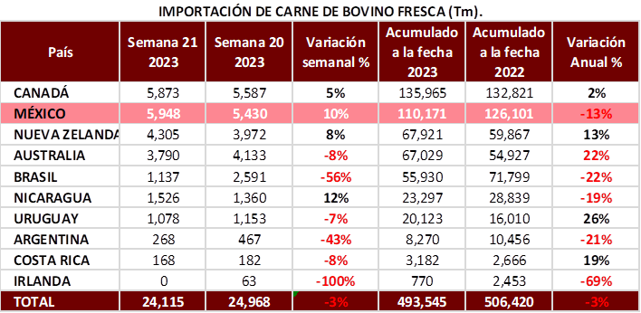 Esta semana el volumen de las importaciones de carne de res fresca a EUA se mantuvo en 24.1 mil Tm, 3% menos que la semana previa, alcanzando así 493.5 mil Tm en lo que va del año.