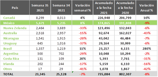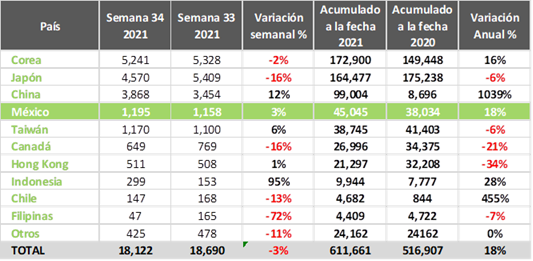 - México es el cuarto comprador, 18% mayor al mismo periodo de 2020.