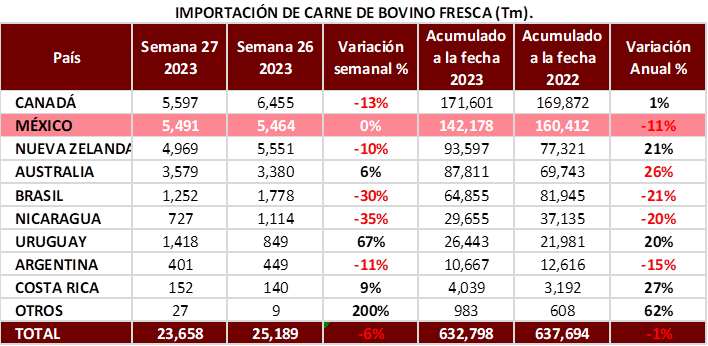 Esta semana, las importaciones de carne de res a EUA presentan un decremento.