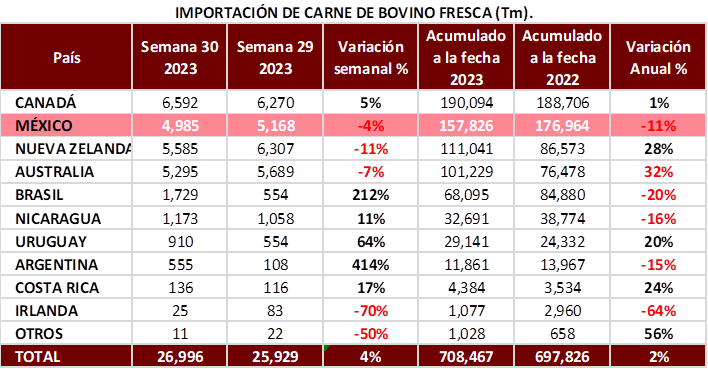 - Las importaciones de carne de res fresca a EUA, esta semana se incrementan en 4% en comparación a la semana pasada, llegando a las 708 mil TM cifra mayor en 2% en comparación al acumulado a la fecha del 202.