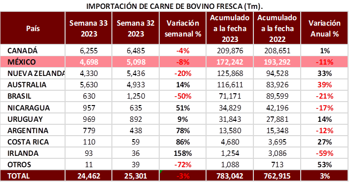 Las importaciones de carne de res fresca esta semana presentan un decremento del 3% contra la semana pasada, alcanzando un total de 783.0 mil TM en lo que va del año, ubicándose 3% por arriba de los niveles alcanzados en el mismo periodo de 2022.