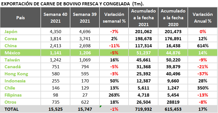 - Japón continúa como el primer comprador, a pesar de su disminución del 7% contra la semana 39 de este año.