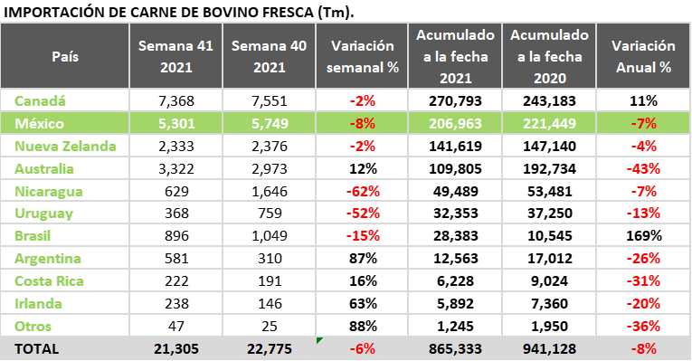 - Como 2do proveedor de carne de res sigue siendo México, en comparación a la semana 40, disminuye 8%. Aún con la disminución del 7% con respecto al año pasado, los cortes que entran al mercado estadounidense representan el 9% del total ingresado al país.