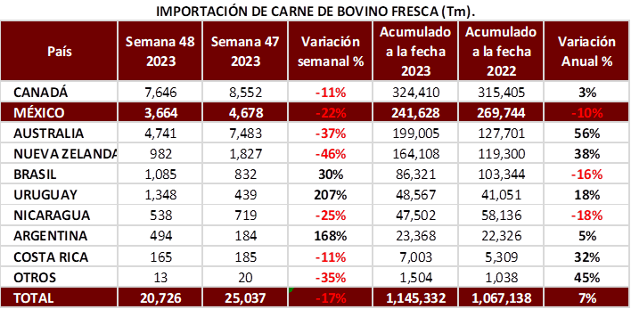 Las importaciones semanales de carne de res de EUA presentan una disminución.