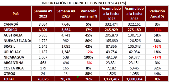 • Las importaciones de carne de res fresca a EUA, esta semana se incrementan en 26% en comparación a la semana pasada, llegando a los 1.171 millones de tm, cifra mayor en 8% en comparación al acumulado a la fecha del 2022.