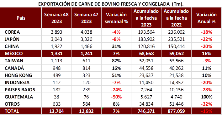 • Esta semana México incrementó sus ventas semanales en 17%, alcanzando las 245.9 mil tm; aún está 11% por debajo del mismo periodo 2022.