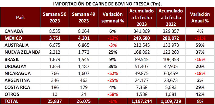 Esta semana las importaciones semanales de carne de res de EUA presentan un retroceso.