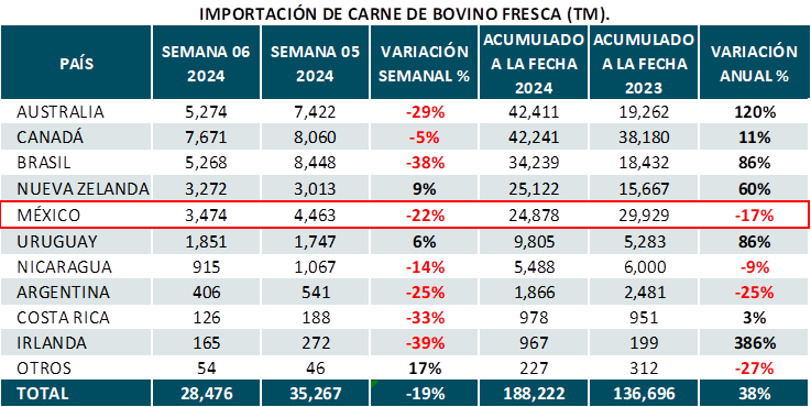 - Las importaciones de carne fresca de res disminuyeron un 19% en comparación con la semana pasada, llegando a un total de 188.2 mil tm en lo que va del año. Esto es un aumento del 38% en comparación con el mismo período de 2023.