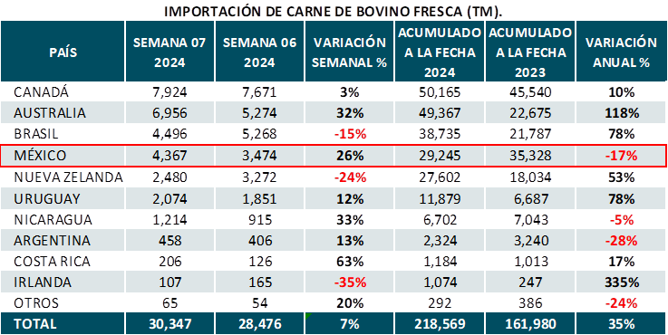 • Las importaciones de carne fresca de res en EUA aumentaron en 7% en comparación con la semana pasada, llegando a un total de 218.5 mil tm en lo que va del año. Lo que representa un incremento del 35% en comparación con el mismo período de 2023.