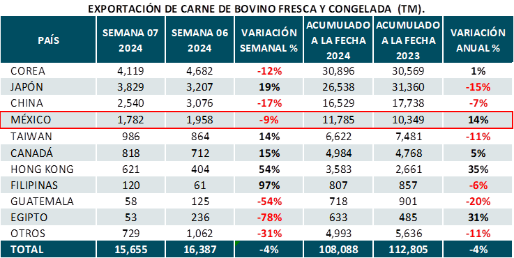 • Las exportaciones semanales disminuyen 4%, con 15.6 mil tm enviadas en la semana 07_2024.