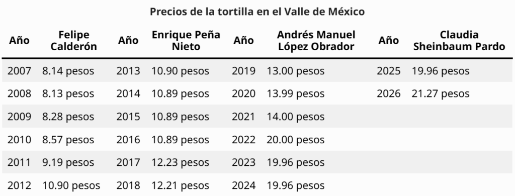 El precio del kilo de tortilla subió más de 63% en términos nominales en el Valle de México durante el gobierno de Andrés Manuel López Obrador y en lo que lleva el de Claudia Sheinbaum.
