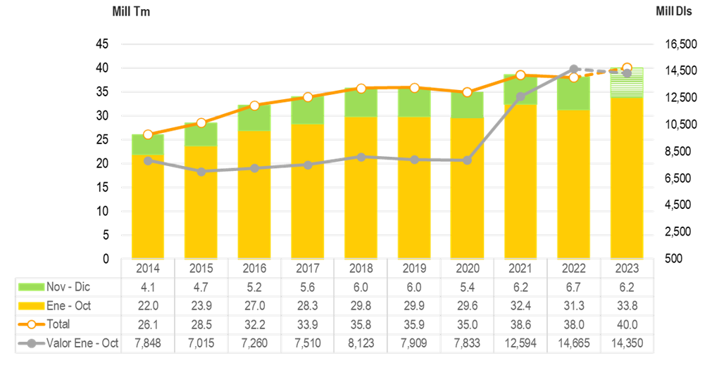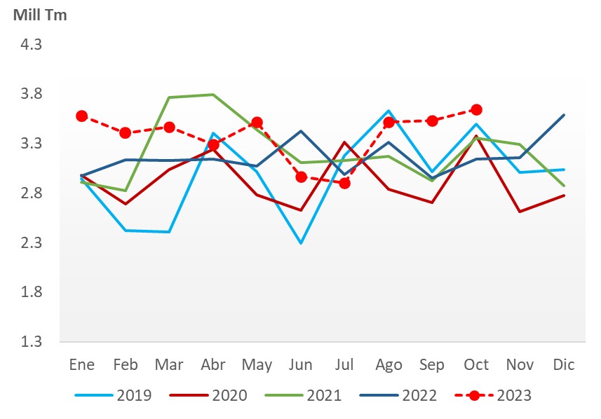 En el acumulado a octubre de 2023, las compras de granos y oleaginosas alcanzan volumen récord con cerca de 34 millones de tm, 8.2% mayor vs el mismo lapso de 2022.