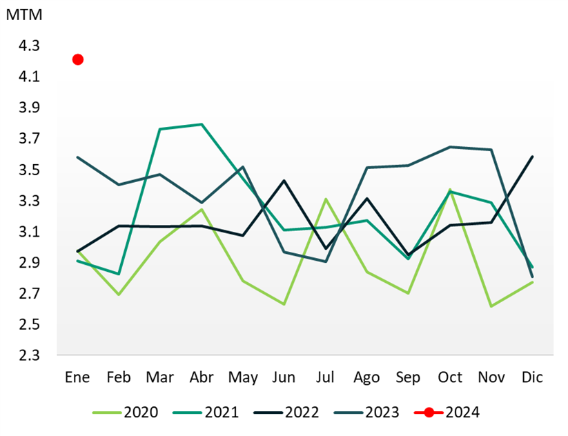 - Al primer mes de 2024, las compras récord de granos y oleaginosas totalizan 4.2 MTM, 17.2% superior al adquirido en 2023; su valor cae 10.2%.