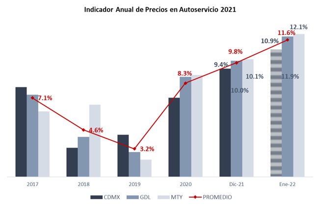 - El precio promedio de la canasta básica en CDMX crece de 9.4% a 10.9%, Guadalajara aumenta de 10.00 % a 11.9% y Monterrey crece de 10.1% a 12.1%.