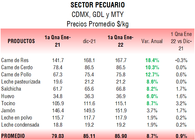 - Aumento en los precios de la cadena: Ganado para sacrificio 21.4% y la carne en canal 19.3%.