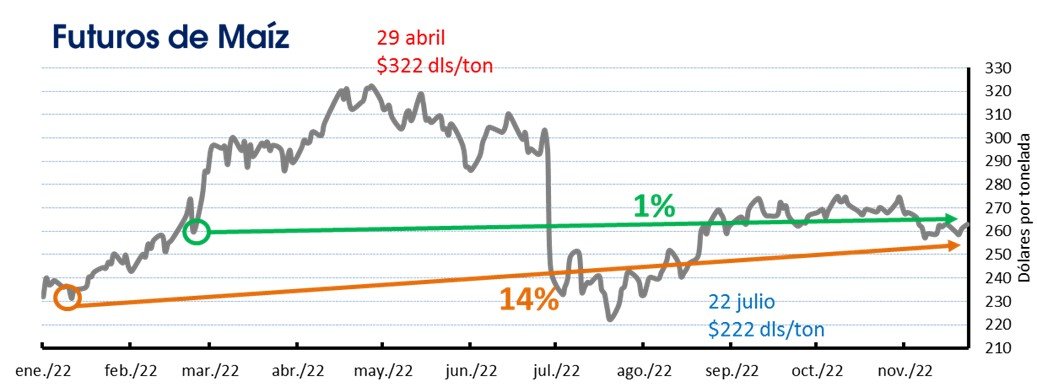 Los precios del cereal están 3 dólares por arriba de lo reportado desde que se concretó la invasión de Rusia a Ucrania el 24 de febrero, una alza del 1%, para situarse en 263 dólares por tonelada. Desde la segunda semana de enero, los precios del maíz han aumentado 32 dólares, un 14%.