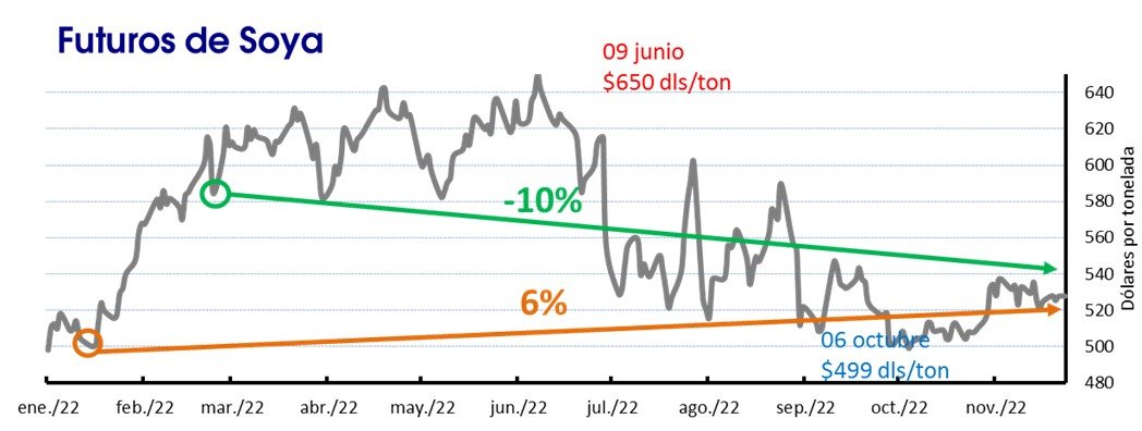 Los precios de la oleaginosa están 57 dólares por debajo de lo reportado desde que se concretó la invasión de Rusia a Ucrania el 24 de febrero, una baja de 10%, para situarse en 528 dólares por tonelada. Desde la segunda semana de enero, los precios han aumentado más de 28 dólares, un 6%.