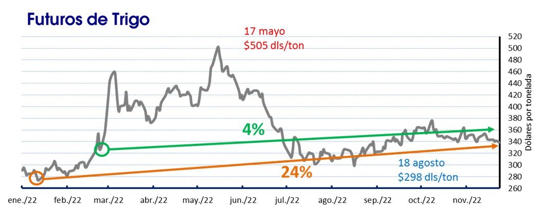 Los futuros del trigo duro están 13 dólares por tonelada por arriba del nivel registrado cuando se detonó el conflicto a finales de febrero, 4% más, para ubicarse en 339 dólares. Desde la segunda semana de enero, los precios del trigo HRW han aumentado 65 dólares, un incremento del 24%.