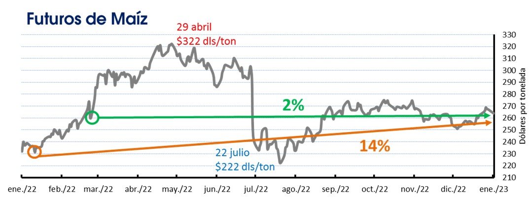 Los precios del cereal están 4 dólares por arriba de lo reportado desde que se concretó la invasión de Rusia a Ucrania el 24 de febrero, un alza del 2%, para situarse en 264 dólares por tonelada. Desde la segunda semana de enero, los precios del maíz han aumentado 33 dólares, un 14%.