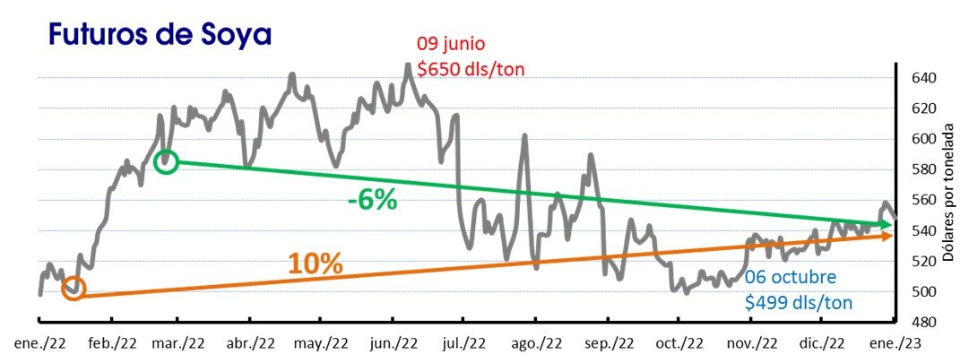 Los precios de la oleaginosa están 36 dólares por debajo de lo reportado desde que se concretó la invasión de Rusia a Ucrania el 24 de febrero, una baja de 6%, para situarse en 548 dólares por tonelada. Desde la segunda semana de enero, los precios han aumentado más de 48 dólares, un 10%.