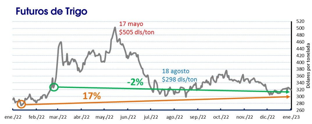 Los futuros del trigo duro están 6 dólares por tonelada por debajo del nivel registrado cuando se detonó el conflicto a finales de febrero, 2% menos, para ubicarse en 319 dólares. Desde la segunda semana de enero, los precios del trigo HRW han aumentado 46 dólares, un incremento del 17%.