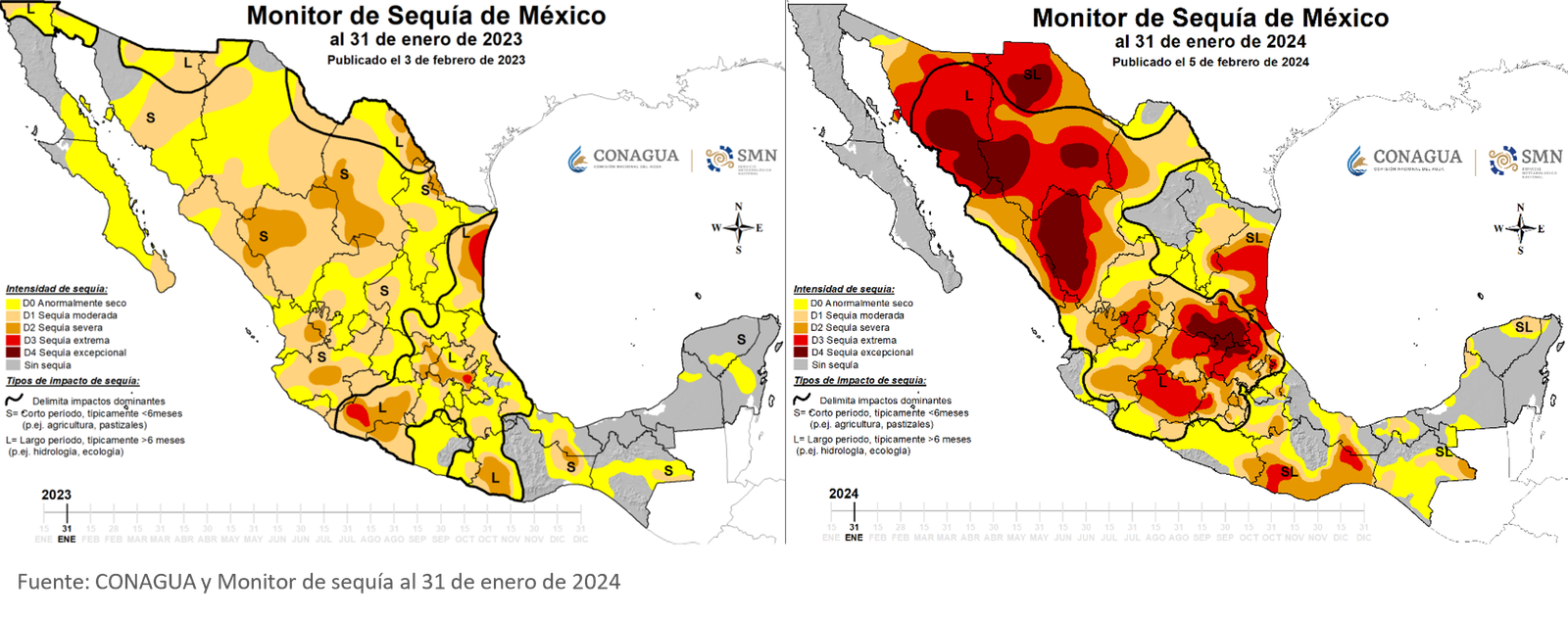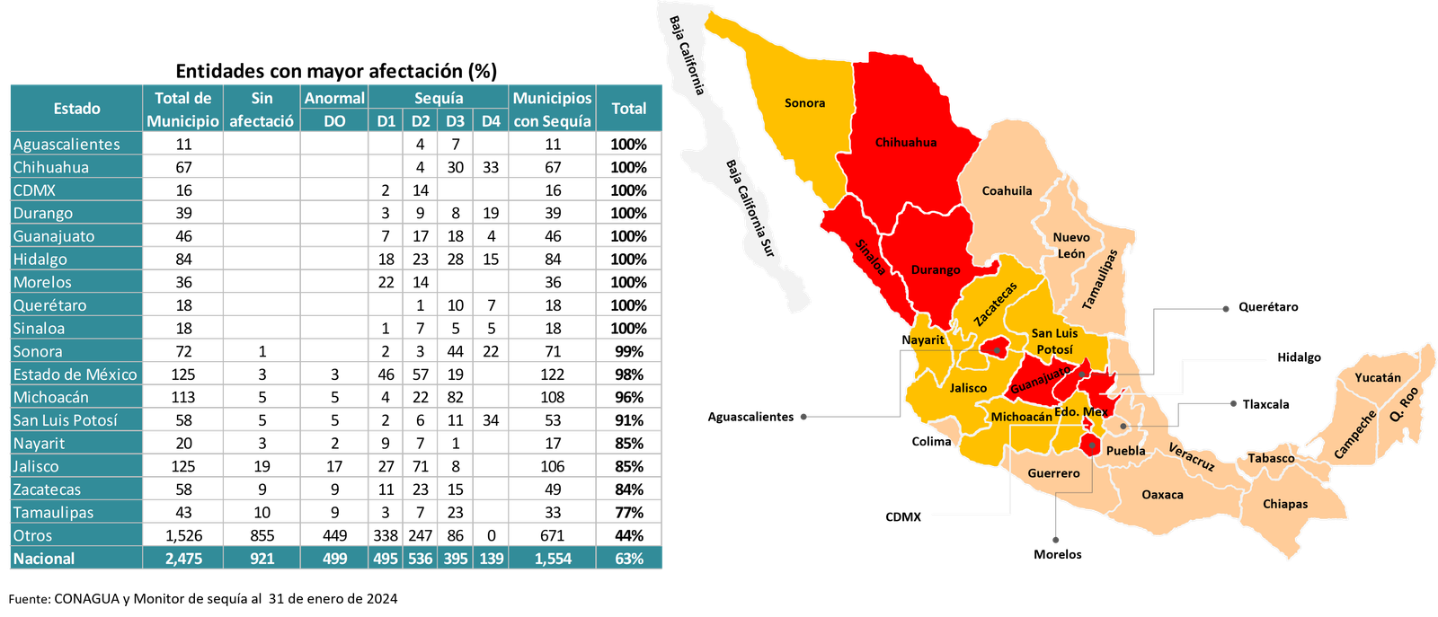 Actualización al 08 de febrero, con cifras del Monitor de sequía de la CONAGUA del 31 de enero de 2024.
