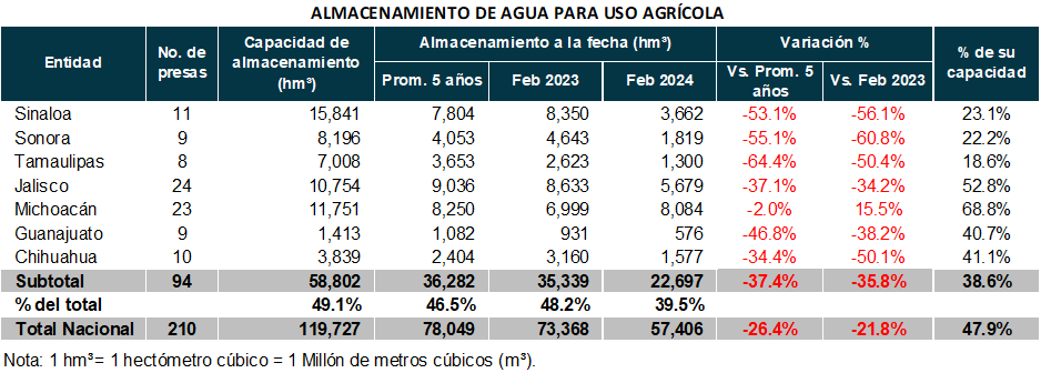 - El nivel de almacenamiento observado de las presas en los principales estados con actividad agrícola con modalidad de riego cayó a 22.7 mil hm³, 37.4% menor al promedio de los últimos 5 años y 35.8% por debajo de lo registrado a la misma fecha del año pasado.
