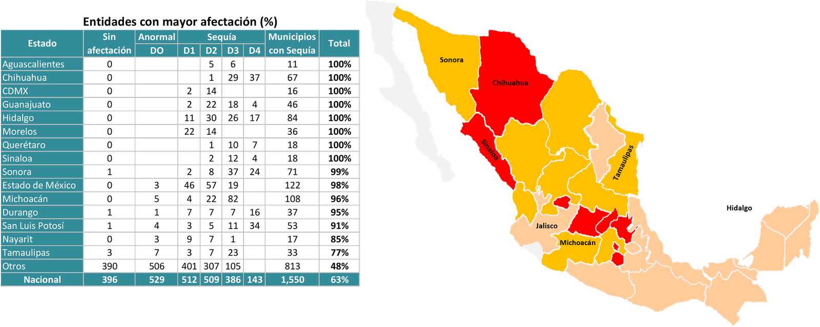 - El número de municipios con algún grado de sequía se redujo a 63% al pasar de 1,563 a 1,550, pero el número de municipios con sequía excepcional continúa en aumento, esta quincena se sumaron 7 municipios más.