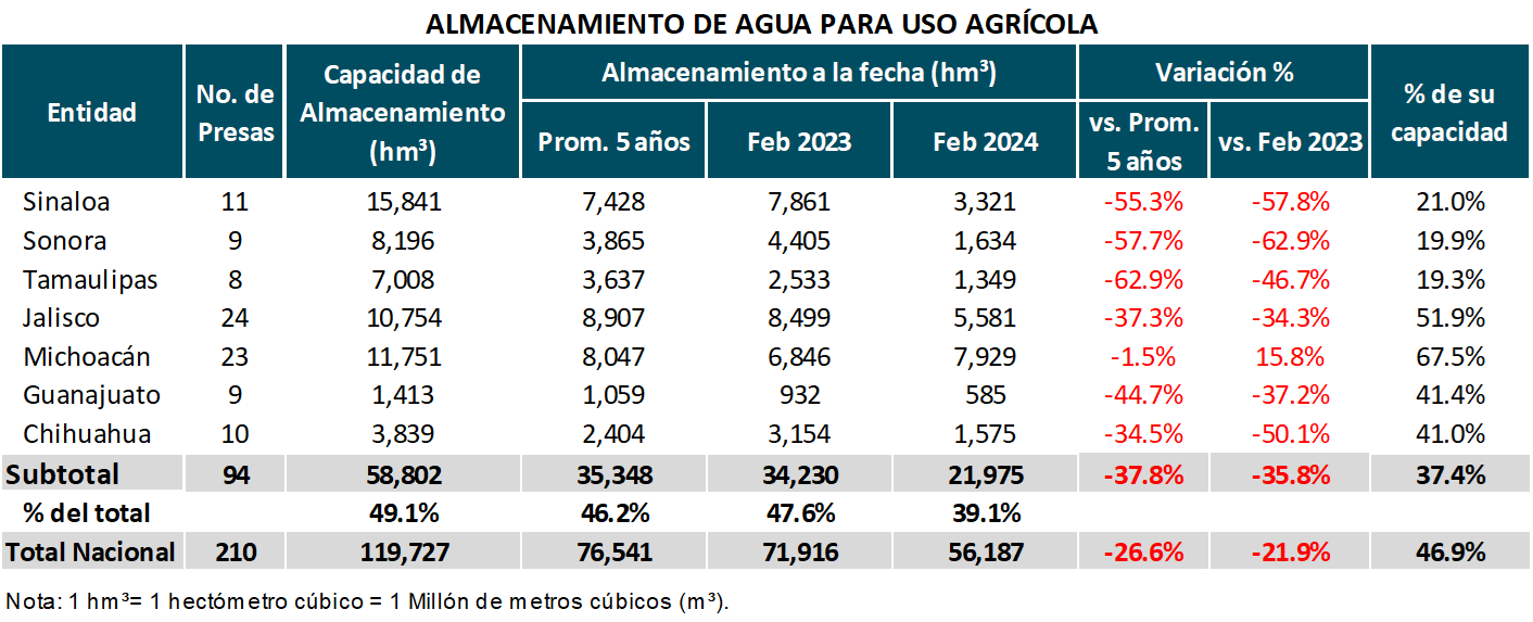 - El nivel de almacenamiento observado de las presas en los principales estados cayó a cerca de 22 mil hm³, 37.8% menor al promedio de los últimos 5 años y 35.8% por debajo de lo registrado a la misma fecha del año pasado.