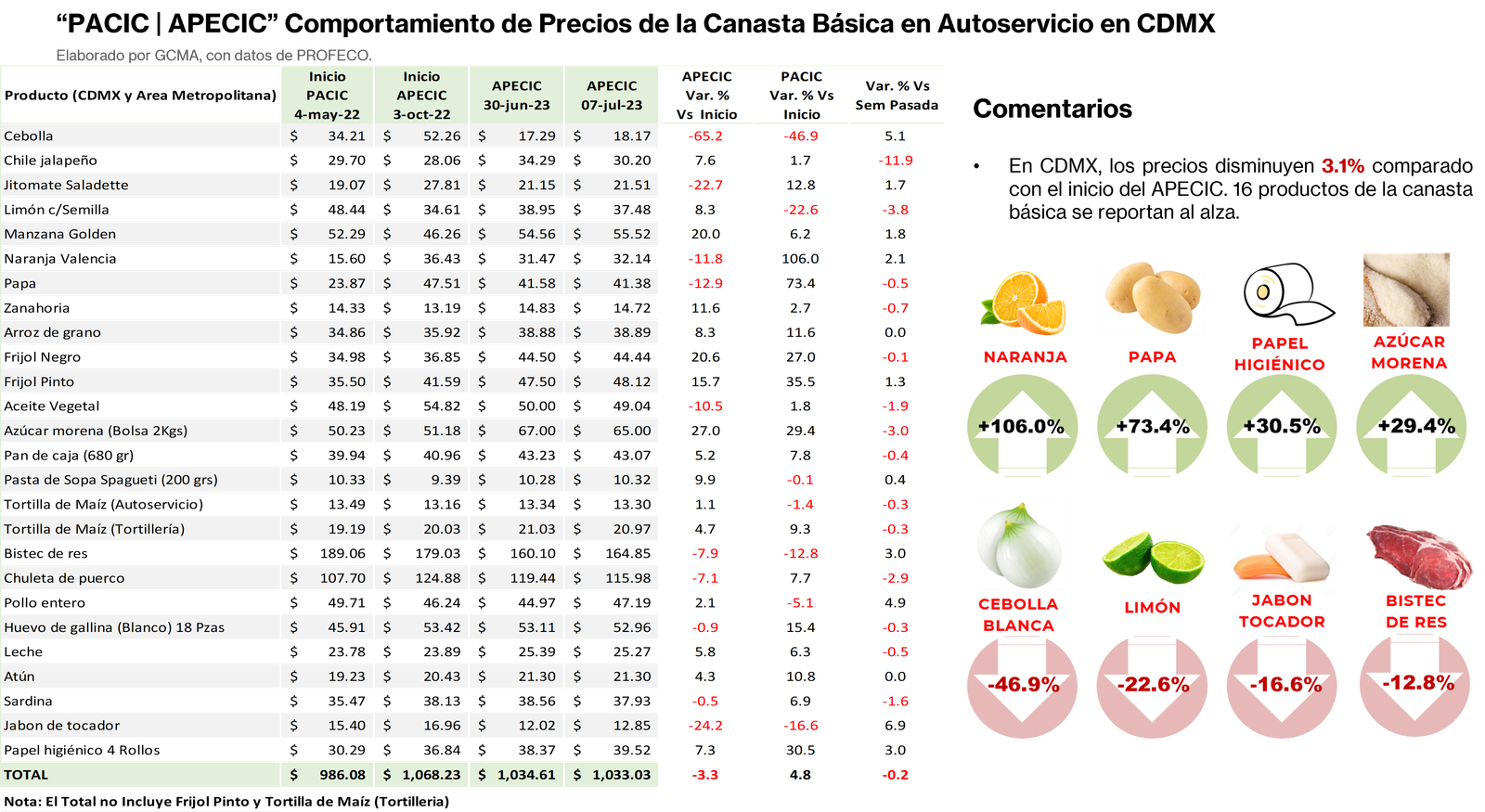 Al 07 de julio, el precio de los Artículos de la Canasta Básica «PACIC | APECIC», se comportaron de la siguiente manera: